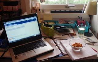 det siste bildet er av scrappepulten min på en effektiv søndag. her er det blogging, skriving av julekort, lekselesing og oppgaveskriving. får jammen plass til mye, men da blir her fullt også:p noen chilinøtter og litt eplesaft hører med til lekse-lesing;)